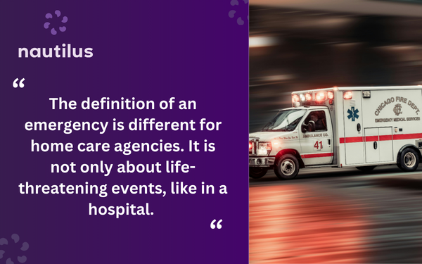The definition of an emergency is different for home care agencies. It is not only about life-threatening events, like in a hospital. An emergency means the client needs assistance and can’t be left alone. Common situations include: