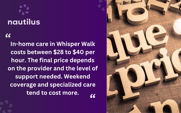 In-home care in Whisper Walk costs between $28 to $40 per hour. The final price depends on the provider and the level of support needed. Weekend coverage and specialized care tend to cost more.